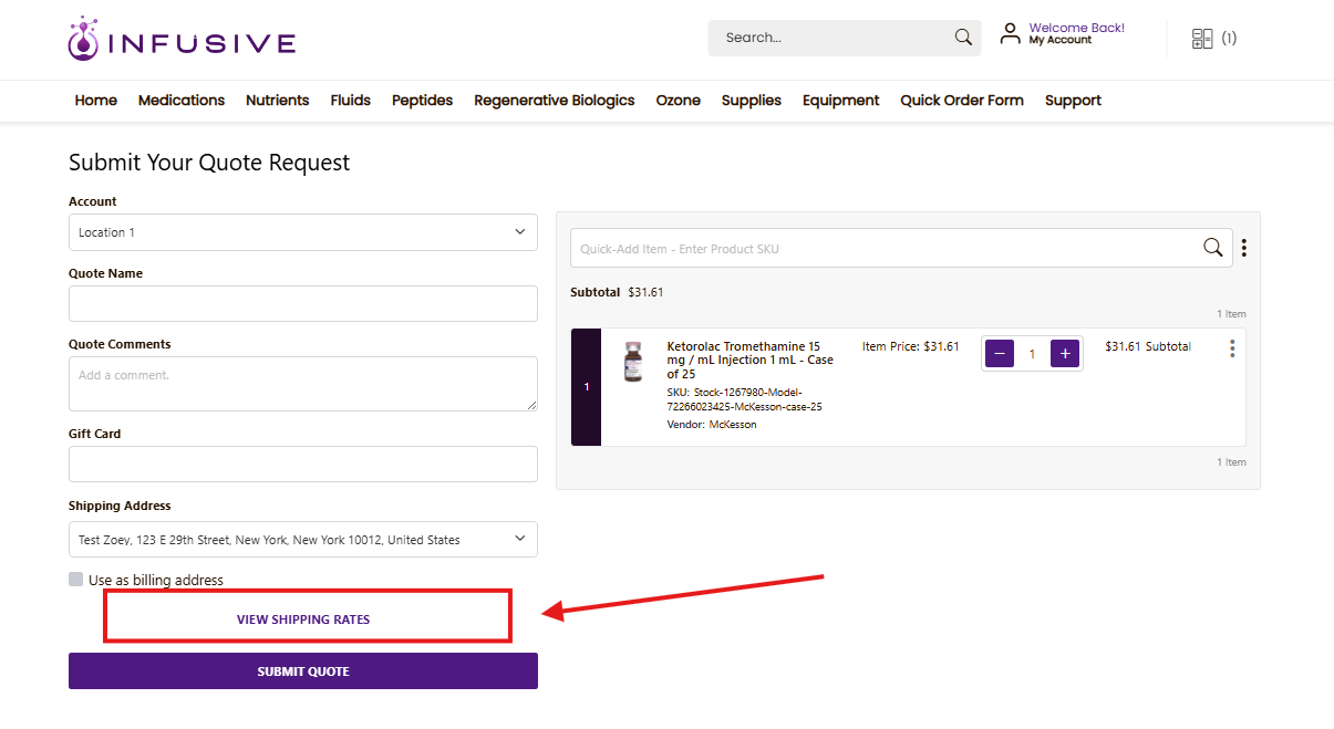 To estimate shipping costs before submitting, click “View Shipping Rates” located above the “Submit Quote” button. This will display a breakdown of each vendor’s shipping fees. (photos below for reference)